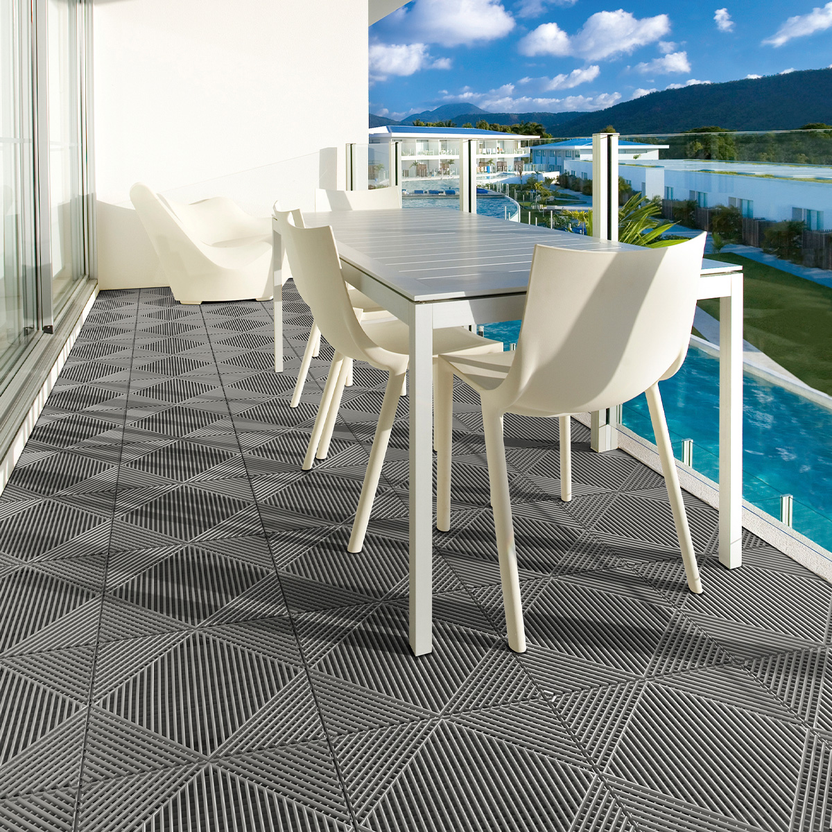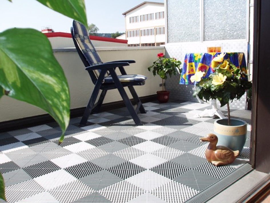 Mit dieser offenen Kunststoff–Klickfliese sind der Kreativität keine Grenzen gesetzt. Die vielen Kombinationsmöglichkeiten und die enorme Belastbarkeit von bis zu 30 Tonnen pro Quadratmeter machen die Klickfliese so wandelbar. Sie findet z.B. Anwendung als Belag für verwitterte Balkone und Terrassen, als Präsentationsfläche für die Garage oder für den Event- und Wellnessbereich.