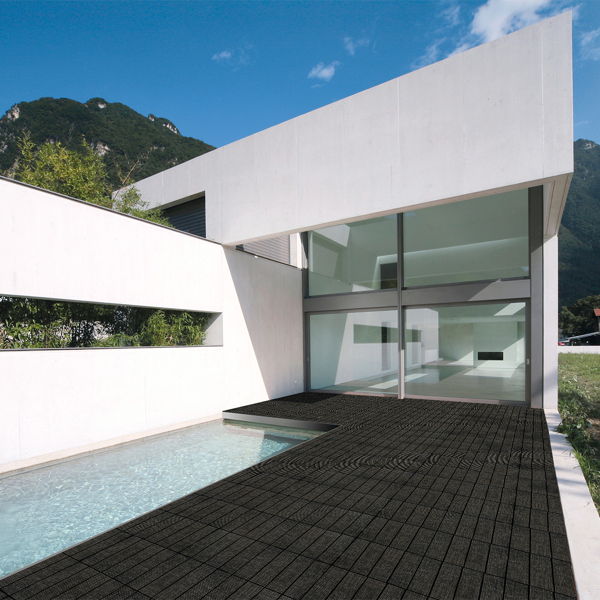 florco® Tex Klickfliesen verbinden die Schönheit und Eleganz einer Textilie mit der Qualität synthetischen Materials. Die verschiedenen Farbtöne spiegeln sich im Sonnenlicht und ergeben ein tolles Lichtspiel. Die Verlegung im Schachbrettmuster bringt diesen Effekt besonders gut zur Geltung. Dank der schimmel- und pilzresistenten Oberfläche aus aus gewebtem Vinyl eignet sich die Klickfliese besonders gut für Lounge-Bereiche und Flächen- um Pools und Planschbecken.